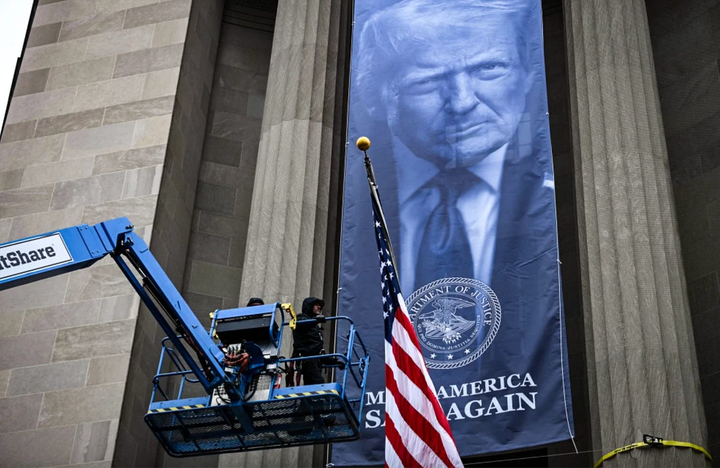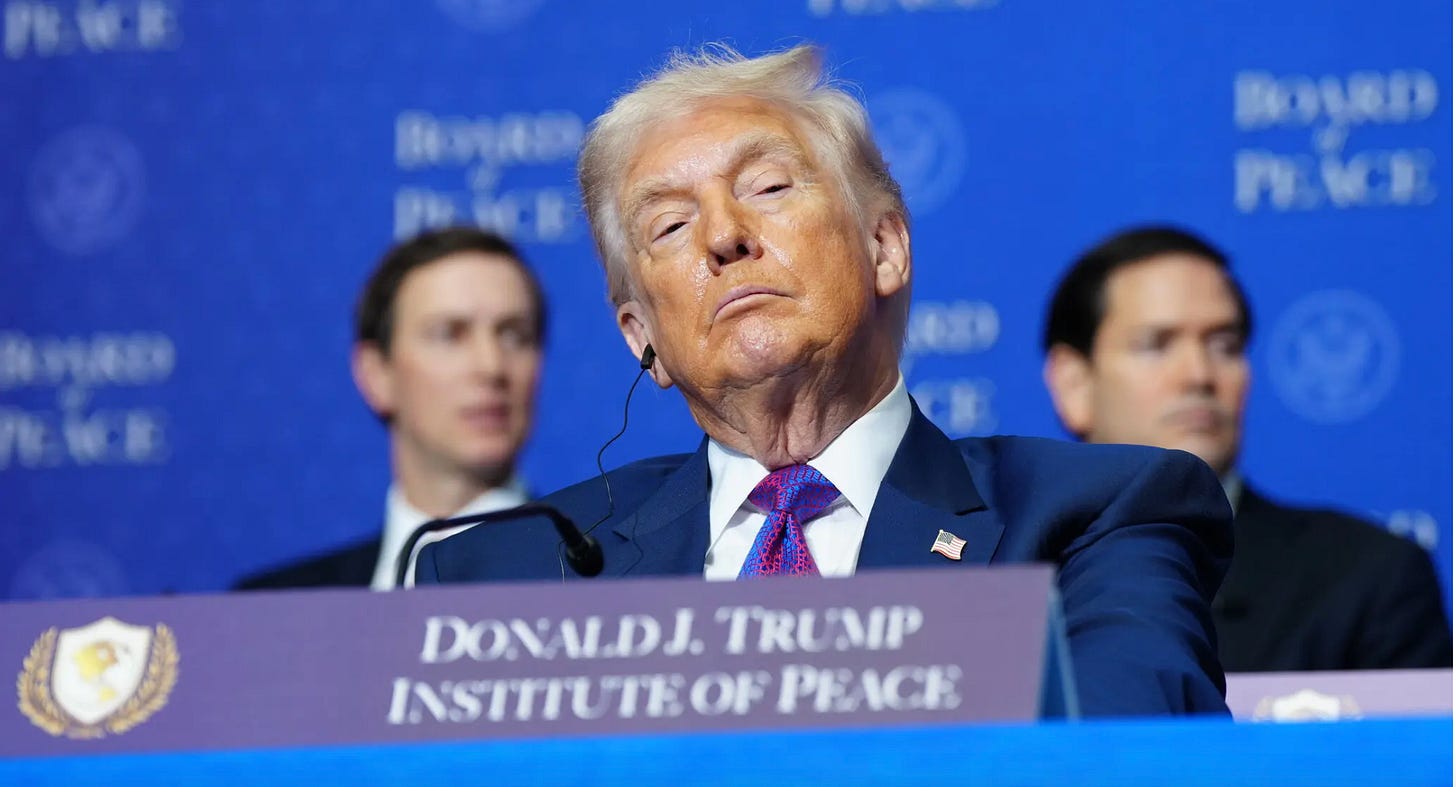 There is nothing like the visit of a gentle and genteel European friend to one’s hometown to jolt one into awareness of our sleepy imperial existence. The day after Krisztina toured the auction gallery, President Donald Trump crazily convened the first meeting of his new UN–replacing, Kabuki entity, the “Board of Peace.” The same day, the Donald’s smug mug went up on a huge banner hung from the columns at the Department of Justice. Friends, if you have not read my little chapbook “The Bully,” please take a glance, as it draws the necessary historic parallel that all too few Trump–watchers have noticed.